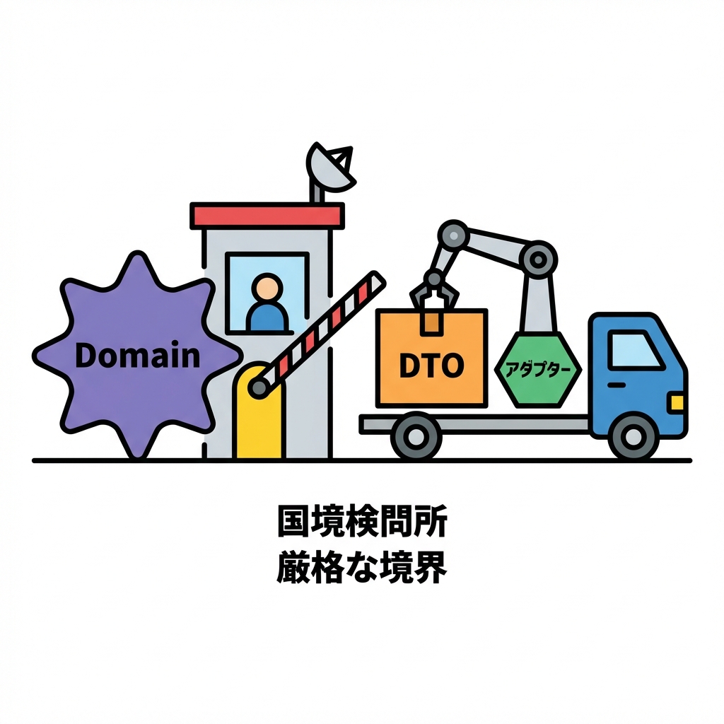 層をまたぐとき(例:Web→Application、Application→DB)に、そのまま中身(ドメイン型)を渡すと事故が起きやすいのね😵💥