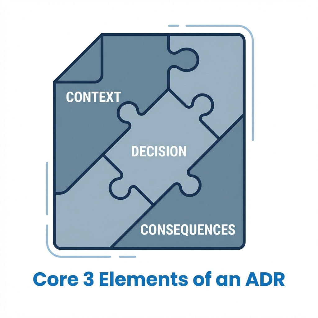 ADRは基本的に 1つの判断 を、だいたい次の要素で記録します👇 Title / Status / Context / Decision / Consequences が定番です🧾✨ (Architectural Decision Records)