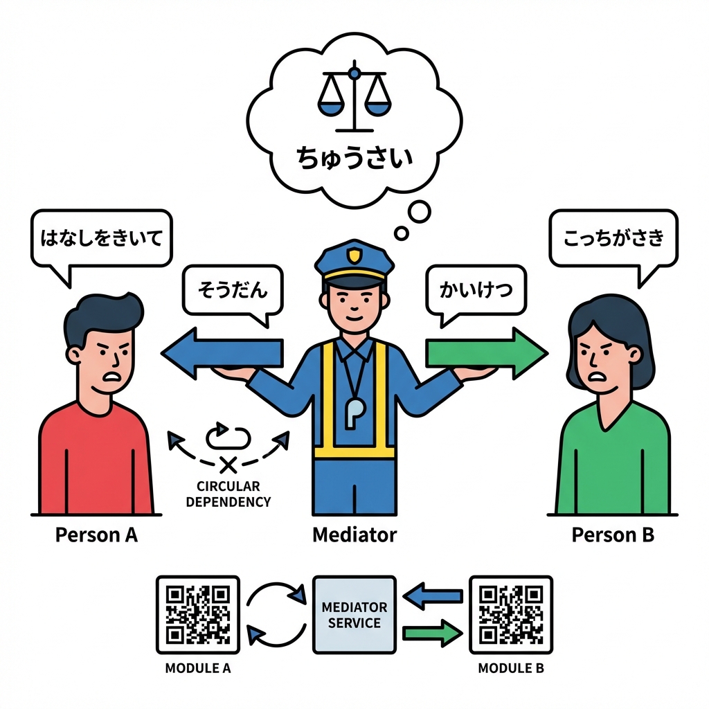 AとBが直接話すから揉めるなら、**間に通訳(仲介役)**を置く作戦だよ🧑⚖️✨ 「Aは仲介役に頼む」「Bも仲介役に頼む」→ AとBが直接依存しない👍