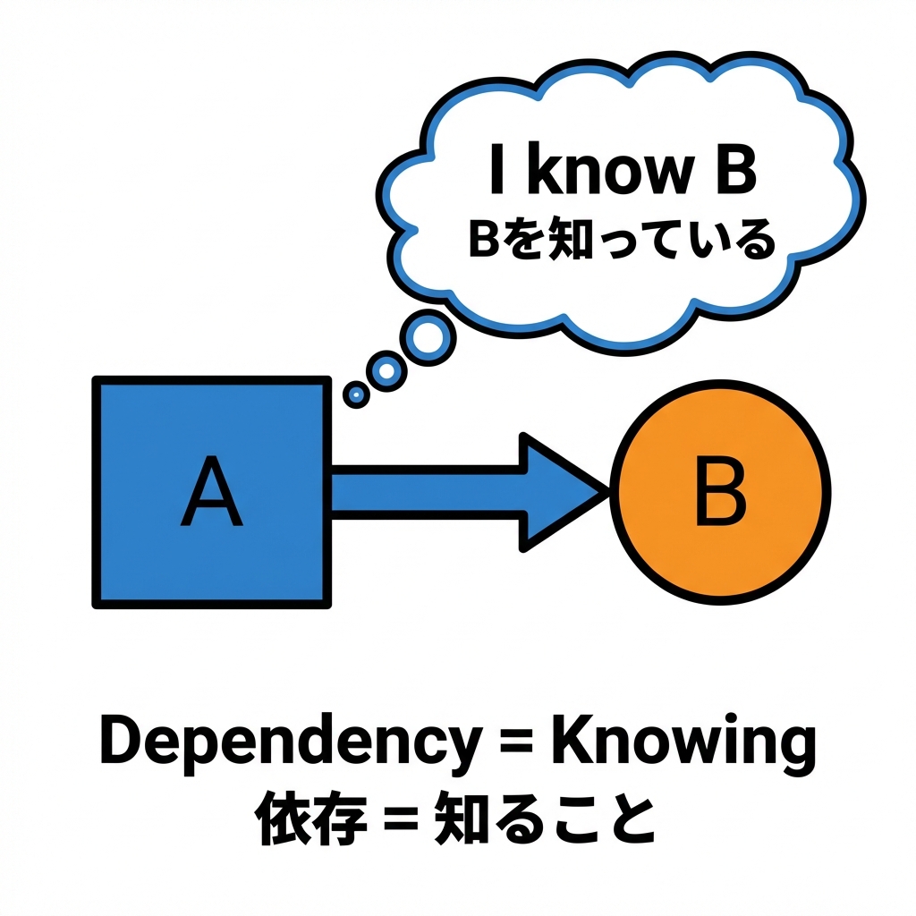 AがBを知らないとコンパイルできないなら、AはBに依存してる(A→B) 🧠✨