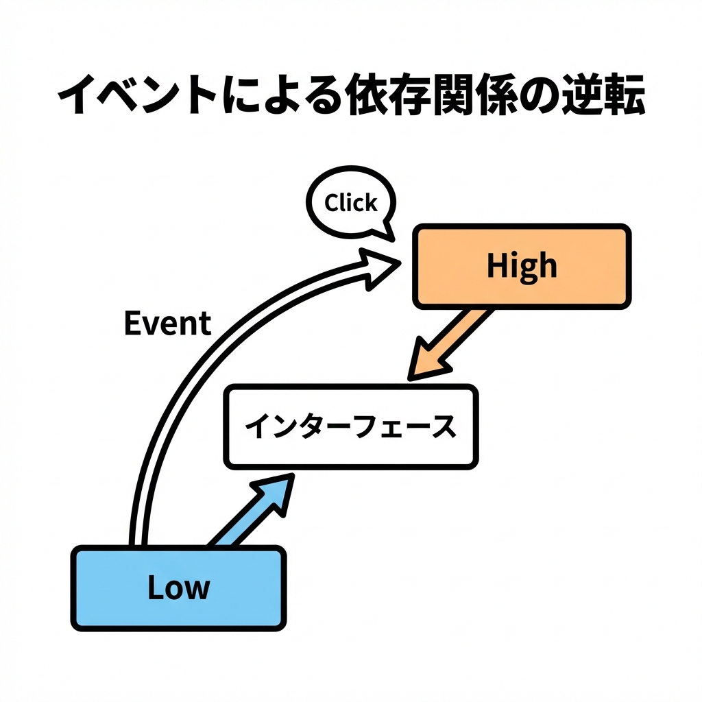 button.Clicked += OnClicked; // 上位は抽象だけ知る