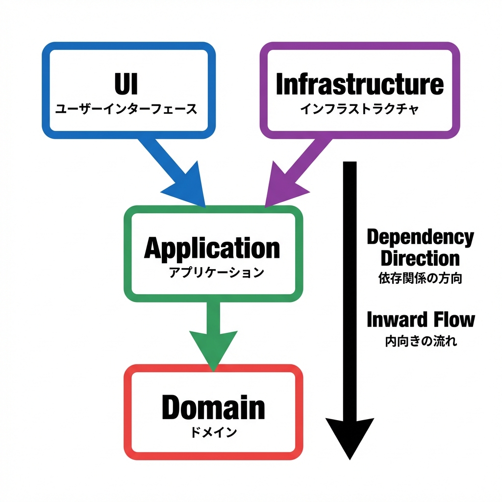 Domain / Application / Infrastructure / UI の依存関係を、ASCII図で矢印付きで描いて。